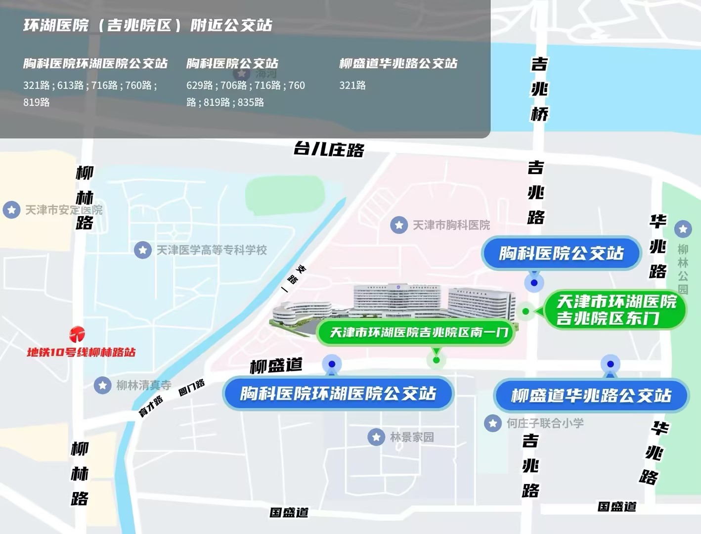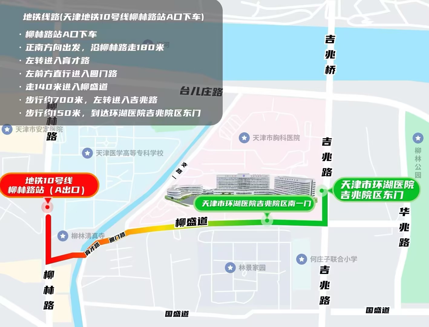 天津地铁10号线柳林路站A口下车-正南方向出发,沿柳林路走180米-左转进入育才路-左前方直行进入圆门路台儿庄路走140米进入柳盛道-步行约700米-左转进入吉兆路-步行约150米-到达环湖医院吉兆院区东门