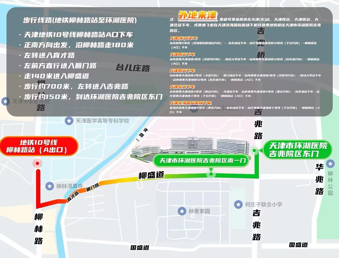 注:外地来津患者可乘坐高铁在天津(东)站、天津西站、天津南站、天津北站下车,或乘坐飞机在天津滨海国际机场下机并换乘地铁前往天津市环湖医院吉兆院区。