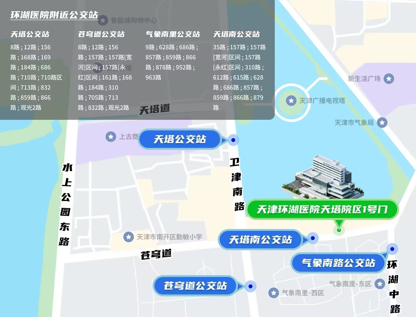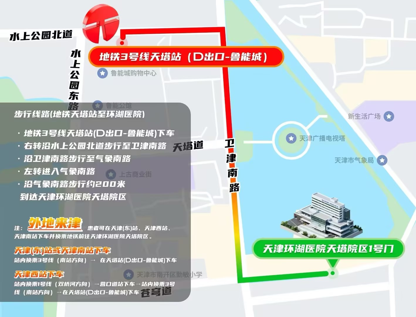 注: 外地来津患者可在天津(东)站,天津西站,天津南站下车并换乘地铁前往天津环湖医院天塔院区。