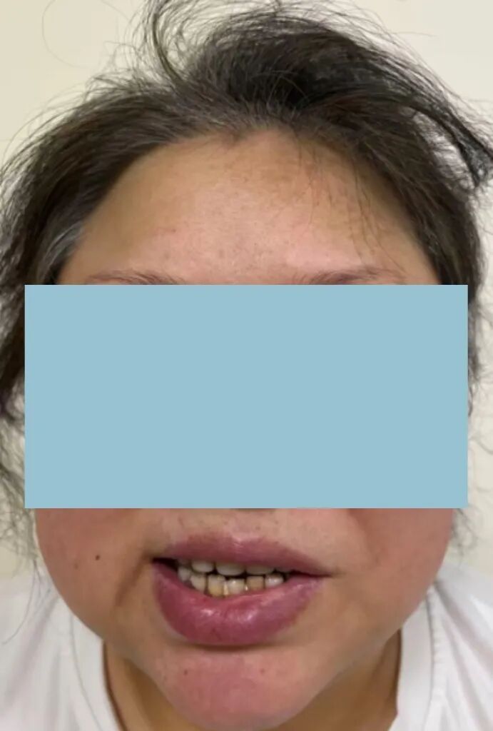 患者微笑时口角歪斜,双侧鼻唇沟不对称