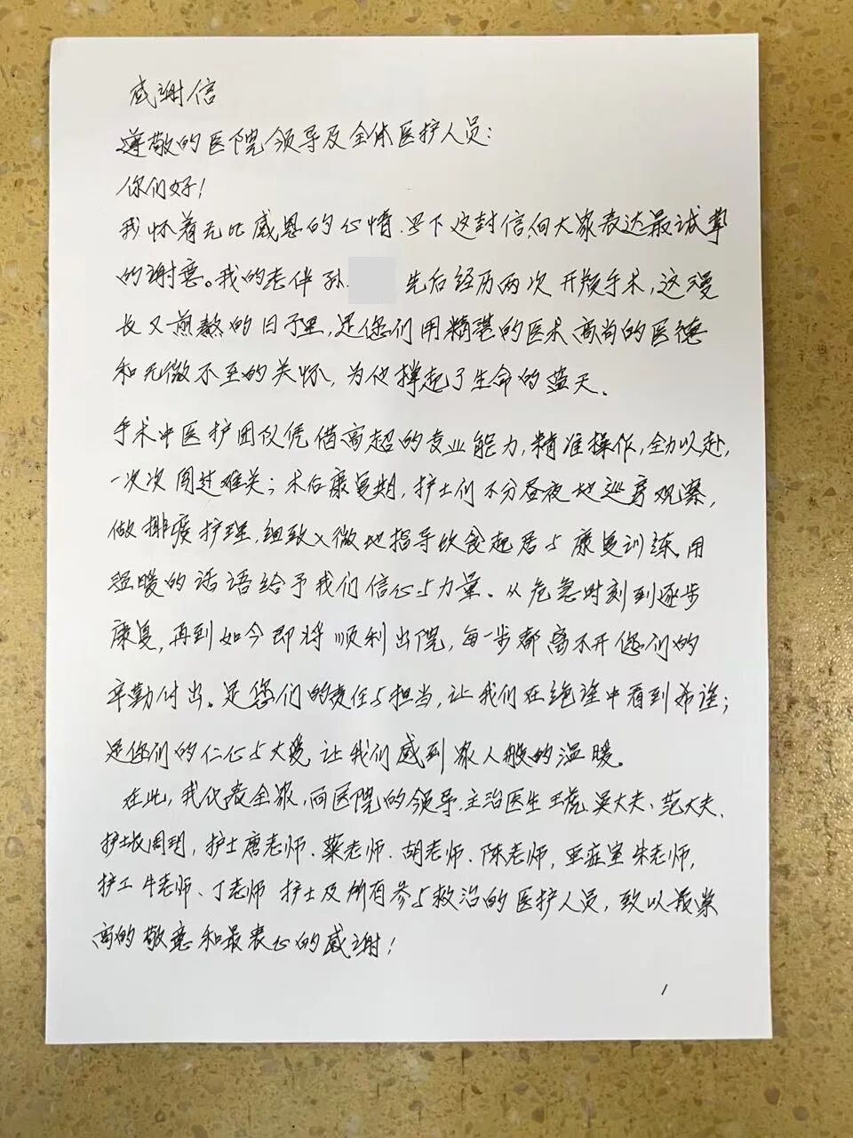 我怀着无比感恩的心情,写下这封信,向大家表达最诚挚的谢意。我的老伴先后经历两次开颅手术,这漫长又煎熬的日子里,是您们用精湛的医术高尚的医德和无微不至的关怀,为他撑起了生命的蓝天。
